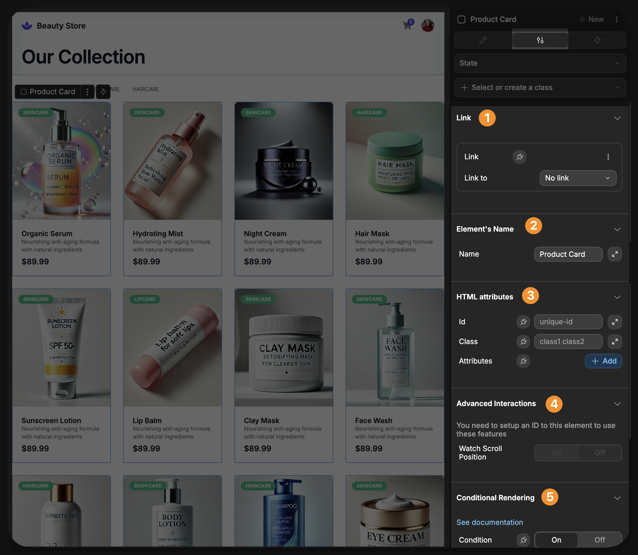 In the example below, we bound a list of products to a Collection List, resulting in the product card being created for every item in the list: